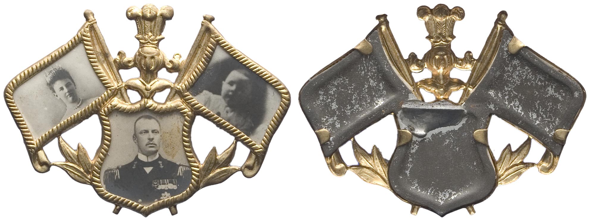 voorzijde: drie foto's: Wilhelmina, Juliana en prins Hendrik, gevat in twee vlaggen en een wapen, met helmstuk.- Trefwoorden