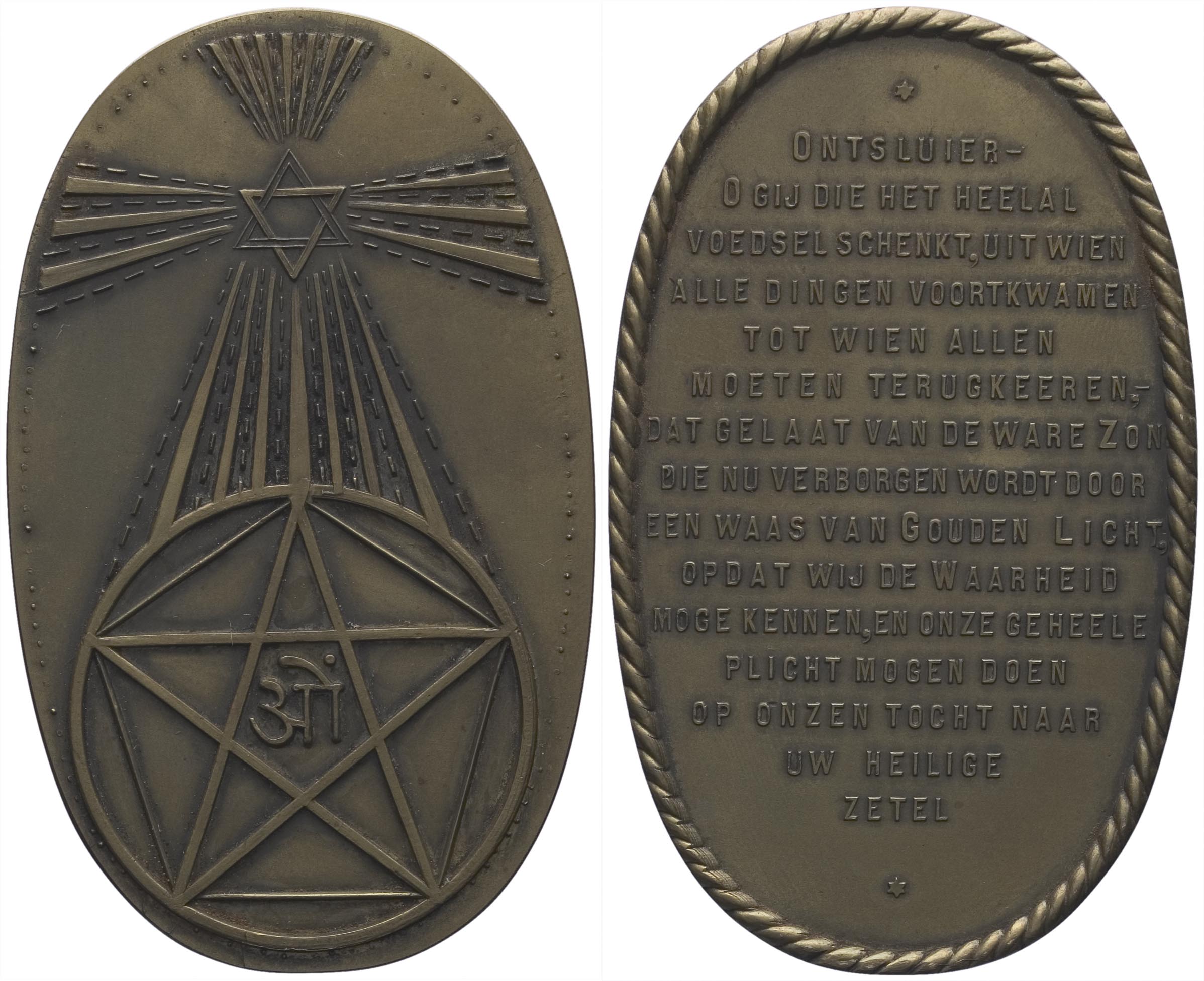 opschrift keerzijde: * / ONTSLUIER- / O GIJ DIE HET HEELAL / VOEDSEL SCHENKT, UIT WIEN / ALLE DINGEN VOORTKWAMEN / TOT WIEN ALLEN / MOETEN TERUGKEEREN-, / DAT GELAAT VAN DE WARE ZON / DIE NU VERBORGEN WORDT DOOR / EEN WAAS VAN GOUDEN LICHT. / OPDAT WIJ DE WAARHEID / MOGE KENNEN, EN ONZE GEHEELE / PLICHT MOGEN DOEN / OP ONZEN TOCHT NAAR / UW HEILIGE / ZETEL / *