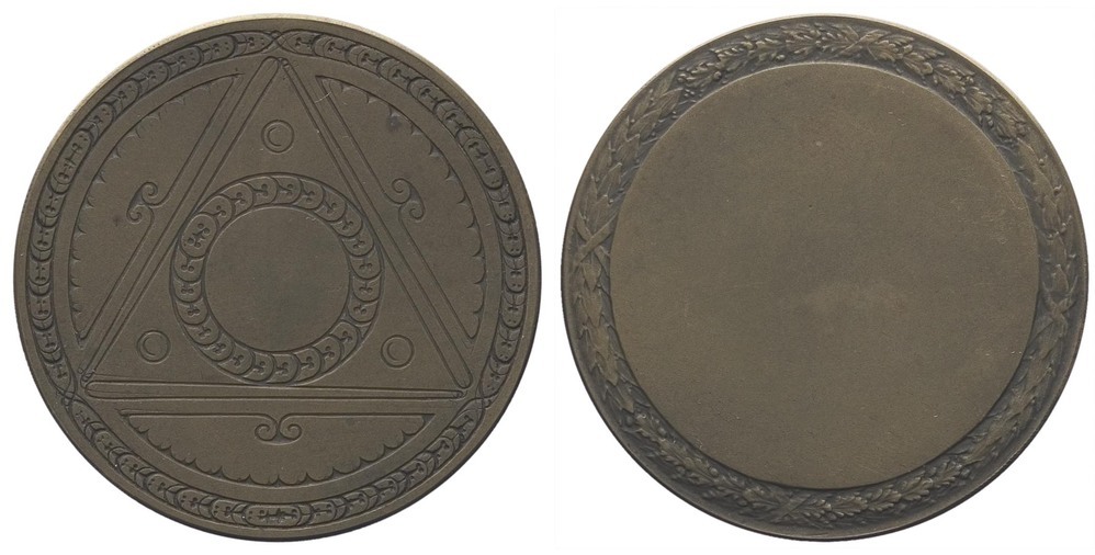 voorzijde: versierde rand, waarbinnen drie keus in een driehoek gelegd. In het midden een versierde cirkel. keerzijde: langs de rand een eikenloof- lauwerkrans, met lint omwikkeld.- Trefwoorden