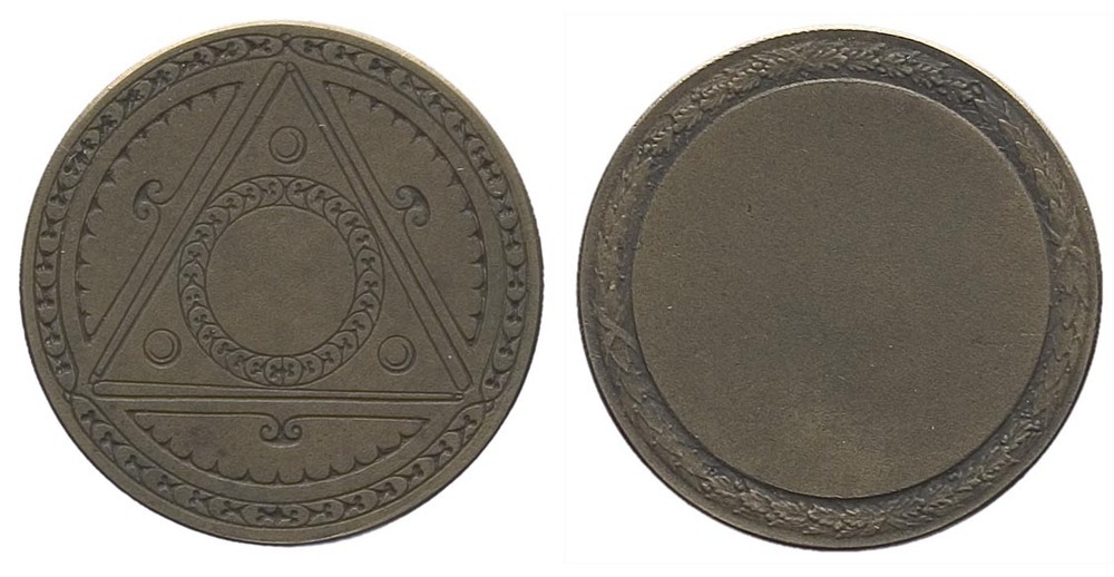 voorzijde: versierde rand, waarbinnen drie keus in een driehoek gelegd. In het midden een versierde cirkel. keerzijde: langs de rand een eikenloof- lauwerkrans, met lint omwikkeld.- Trefwoorden