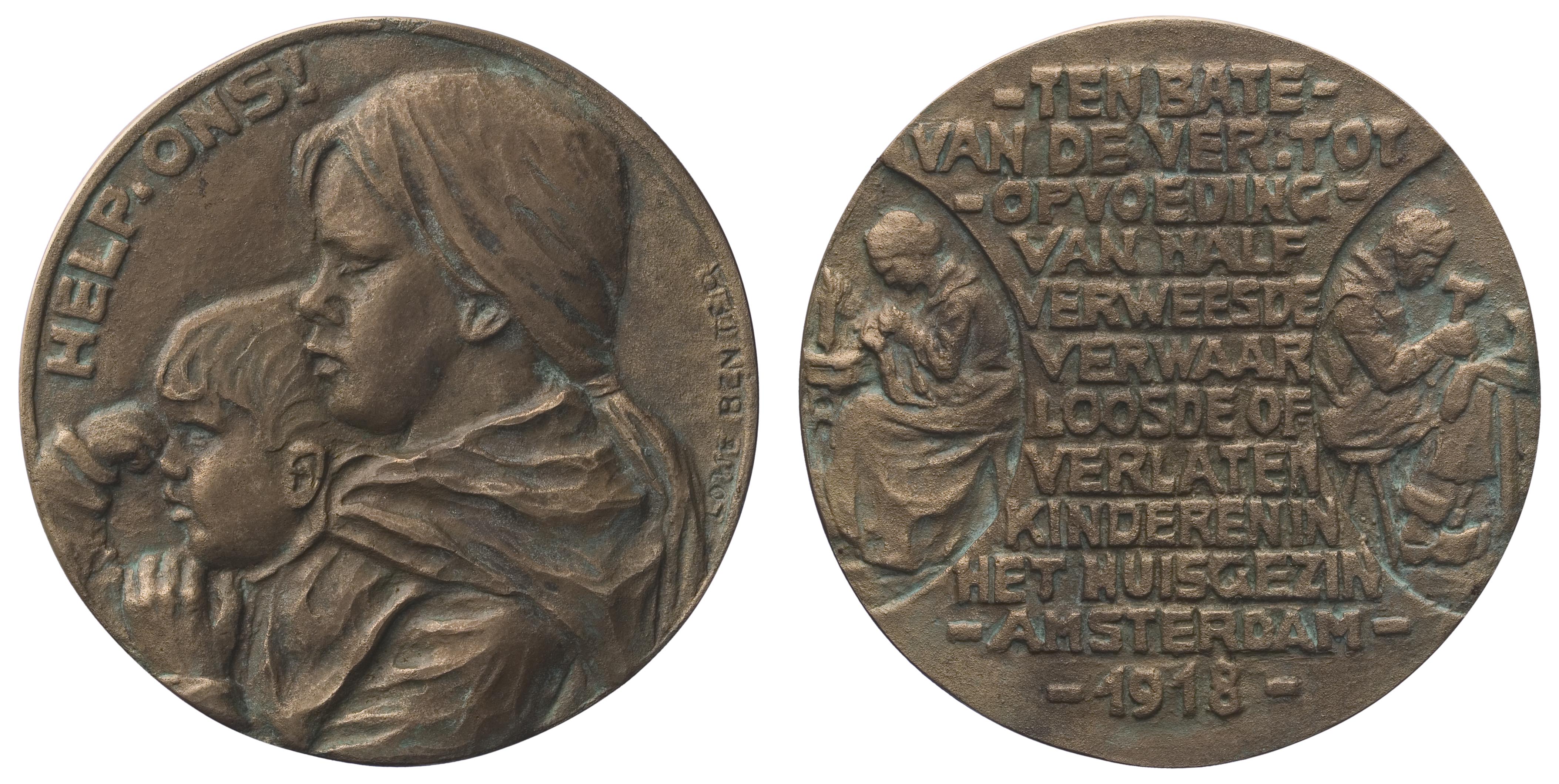 opschrift keerzijde: - TEN BATE - / VAN DE VER. TOT / - OPVOEDING - / VAN HALF / VERWEESDE / VERWAAR / LOOSDE OF / VERLATEN / KINDEREN IN / HET HUISGEZIN / - AMSTERDAM - / - 1918 -