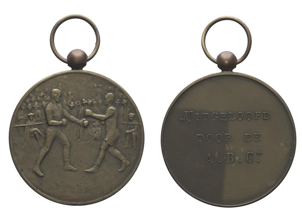 voorzijde: twee boksers in gevecht met publiek op de achtergrond. Bovenaan een oog met ring. keerzijde: een opschrift.- Trefwoorden