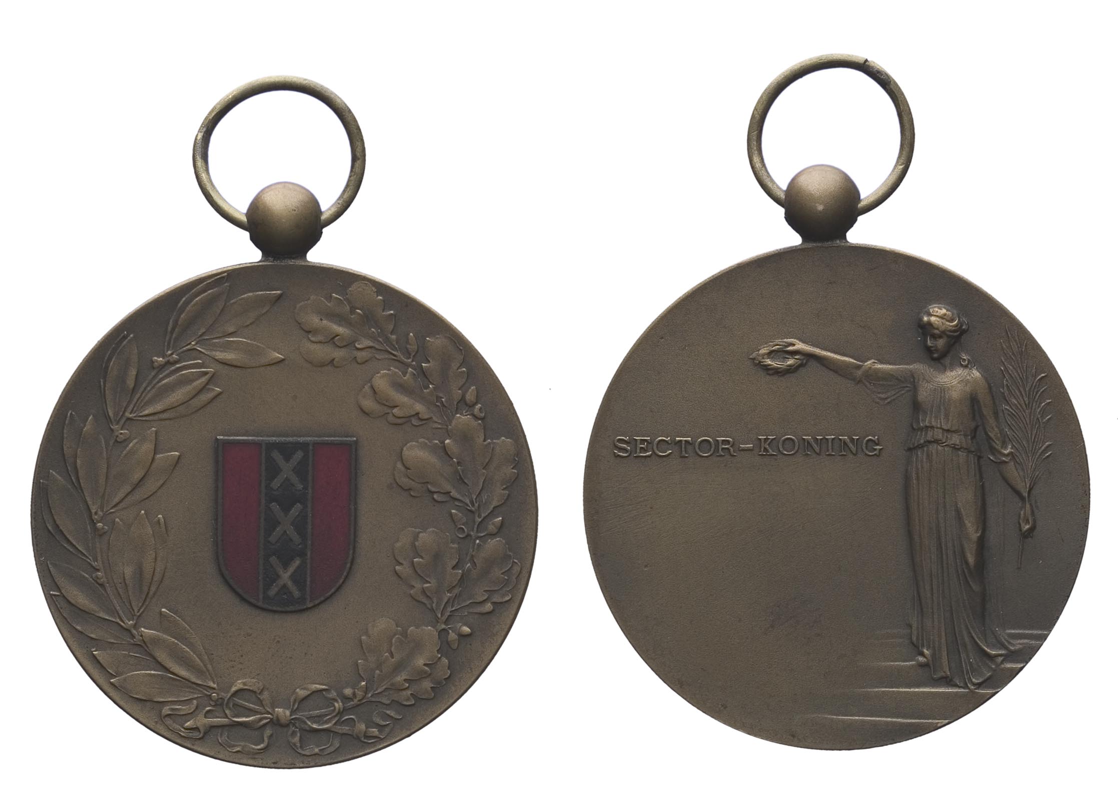voorzijde: in een eikenloof- lauwerkrans het stadswapen van Amsterdam. Bovenaan een oog met ring.