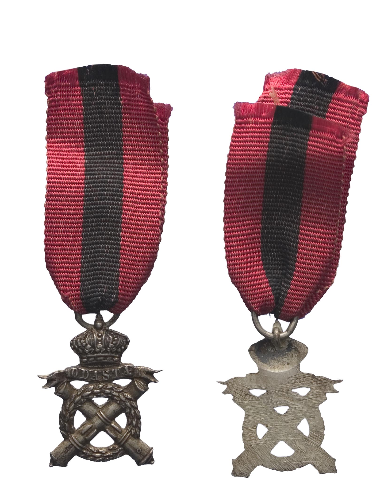 voorzijde: twee gekruiste kanons gevlochten in een lauwerkrans, opengesneden, waarboven een banner met opschrift. Daarbocen een koningskroon. Deze is voorzien van een oog, waaraan een lint met drie banen, rood-zwart-rood. keerzijde: onbewerkt.