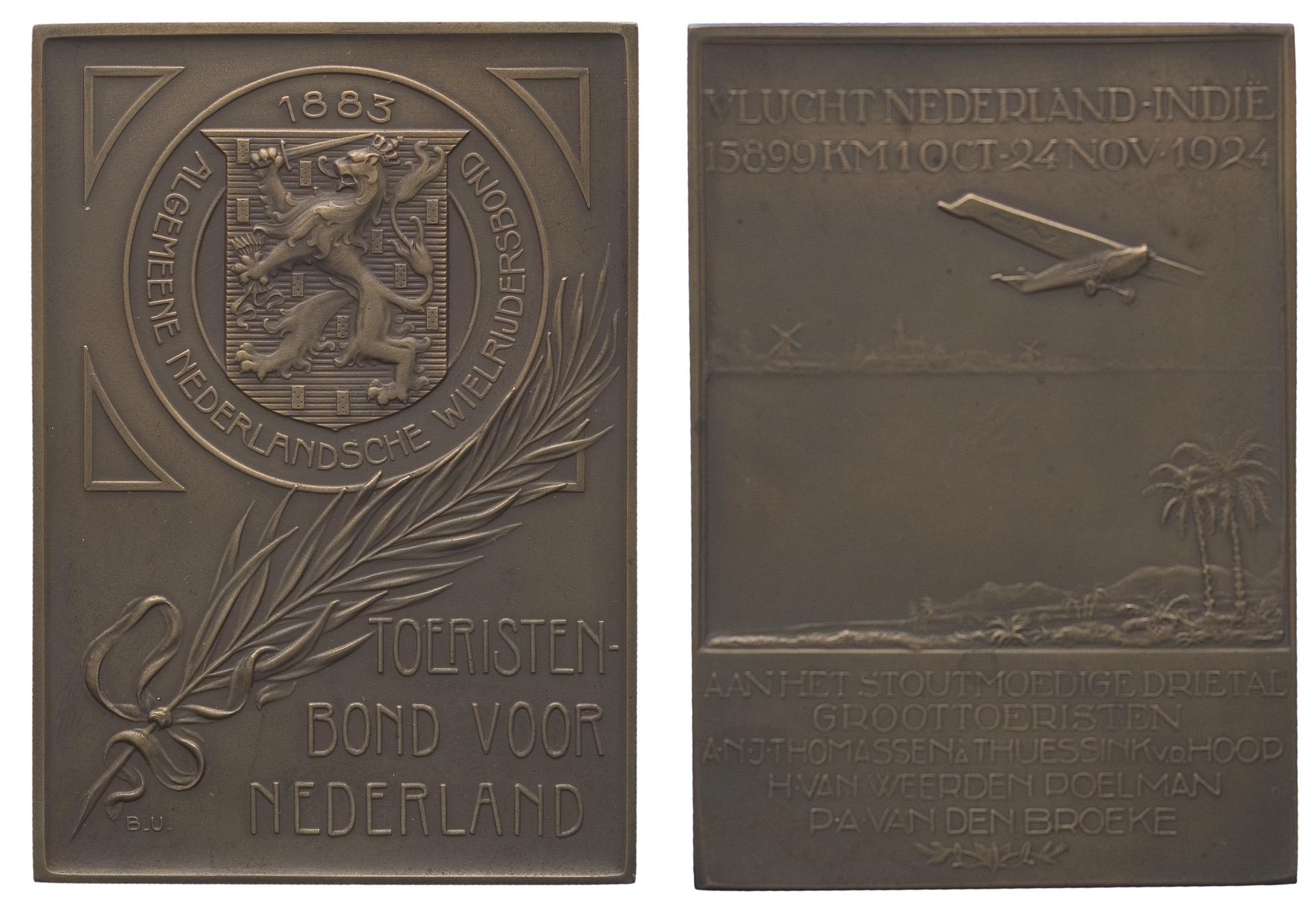 opschrift keerzijde: AAN HET STOUTMOEDIGE DRIETAL / GROOTTOERISTEN / A.N.J. THOMASSEN Á THUESSINK VD HOOP / H. VAN WEERDEN POELMAN / P.A. VAN DEN BROEKE