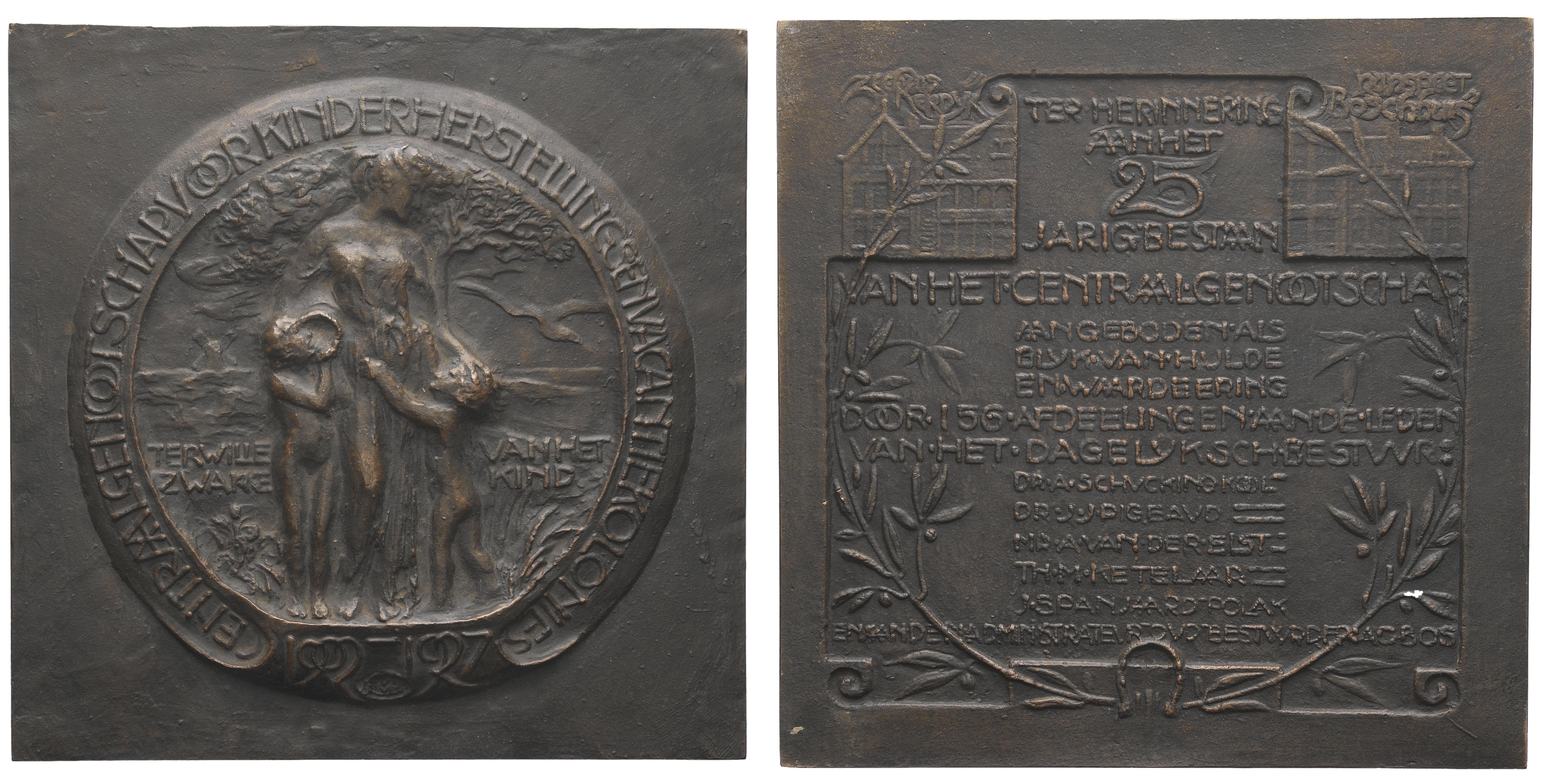 opschrift keerzijde: TER HERINNERING / AAN HET / 25 / JARIG . BESTAAN / VAN HET . CENTRAAL . GENOOTSCHAP / AANGEBODEN . ALS / BLYK . VAN . HULDE / EN . WAARDEERING / DOOR . 156 . AFDEELINGEN . AAN . DE . LEDEN / VAN . HET . DAGELYKSCH . BESTUUR / dR.a.SCHVCKING KOOL / DR.J.J.PIGEAVD / MR.A.VAN.DER.ELST / TH.M.KETELAAR / J.SPANJAARD-POLAK / EN . AAN . DEN . ADMINISTRATEVR . OVD . BESTUURDER . A.C.BOS