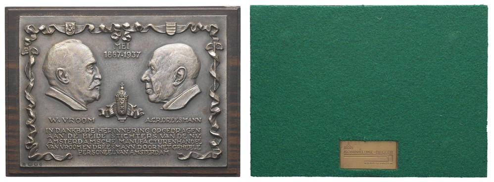 opschrift voorzijde: W. VROOM / A.C.R. DREESMANN / IN DANKBARE HERINNERING OPGEDRAGEN / AAN DE BEIDE STICHTERS VAN DE n.v. / AMSTERDAMSCHE MANUFACTURENHANDEL / VAN VROOM EN DREESMANN DOOR HET GEHEELE / PERSONEEL VAN AMSTERDAM