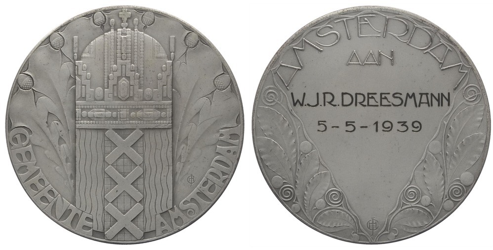 voorzijde: het gekroonde wapen van Amsterdam, tussen gestyleerd eikenloof met eikels. Een omschrift met onderaan en een signatuur in de vorm van een monogram rechtsonder.