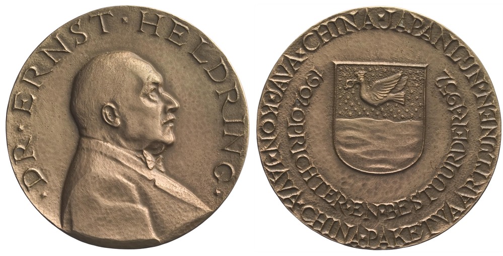 Dr. Ernst Heldring, oprichter en bestuurder Java-China-Japanlijn en de Kon. Java-China-Paketvaartlijn, 1952 brons hoogte: 7.1 cm; breedte: 7.1 cm; diepte: 0.4 cm; gewicht: 92.98 gr; omschrift voorzijde: . DR . ERNST . HELDRING .