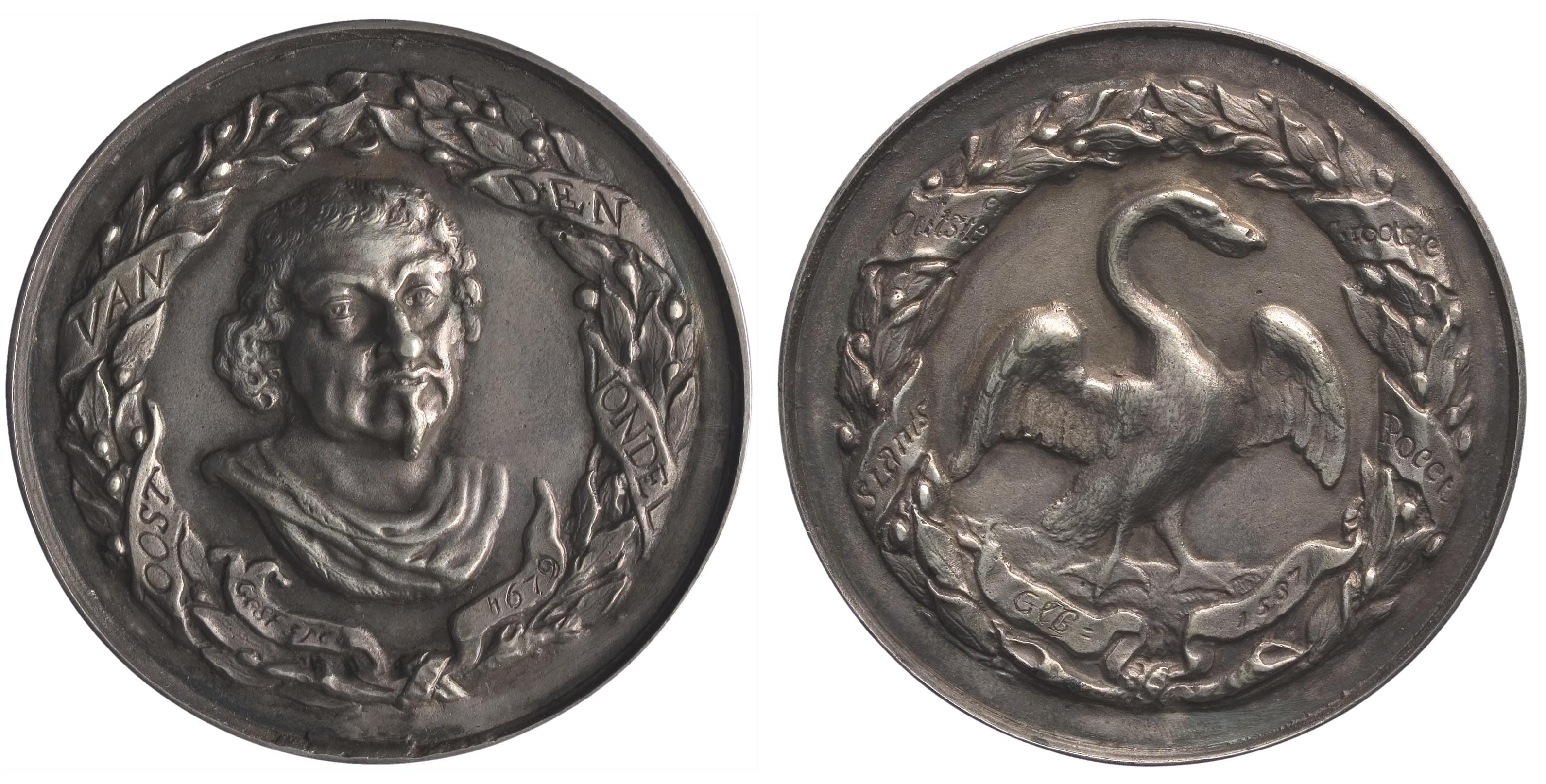 Beeld voorzijde: borstbeeld van Joost van den Vondel; daaromheen een krans met lint met opschrift Beeld keerzijde: staande zwaan met gespreide vleugels; daaromheen een krans met lint met opschrift- Trefwoorden