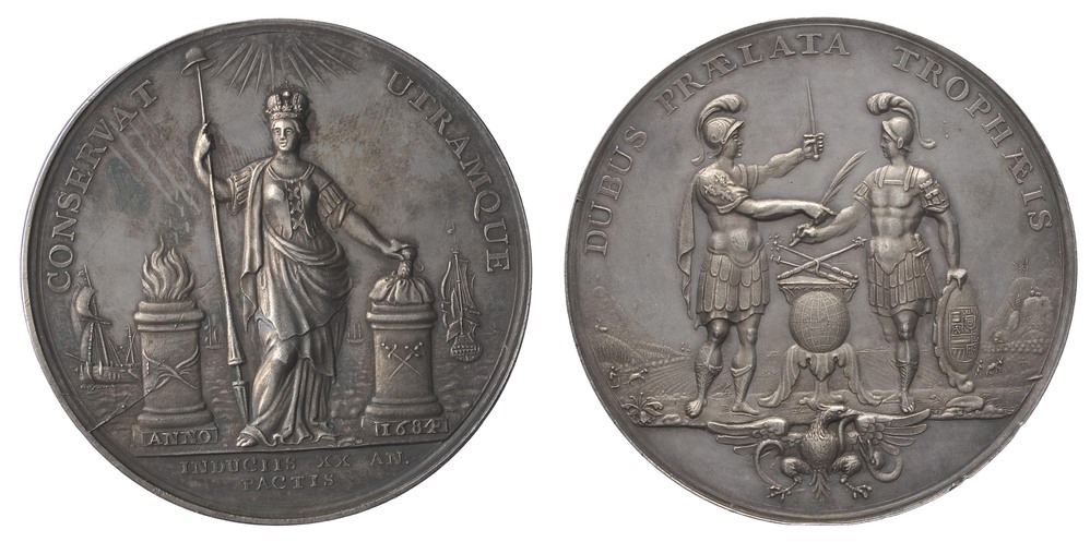 voorzijde: in een Latijns omschrift staan Frankrijk (links met zwaard) en Spanje (rechts met palmtak en schild) in krijgstenu bij een altaar met wereldbol, met op de voorgrond de keizerlijke arend die een slang doodt; op de achtergrond bewerkte akkers.