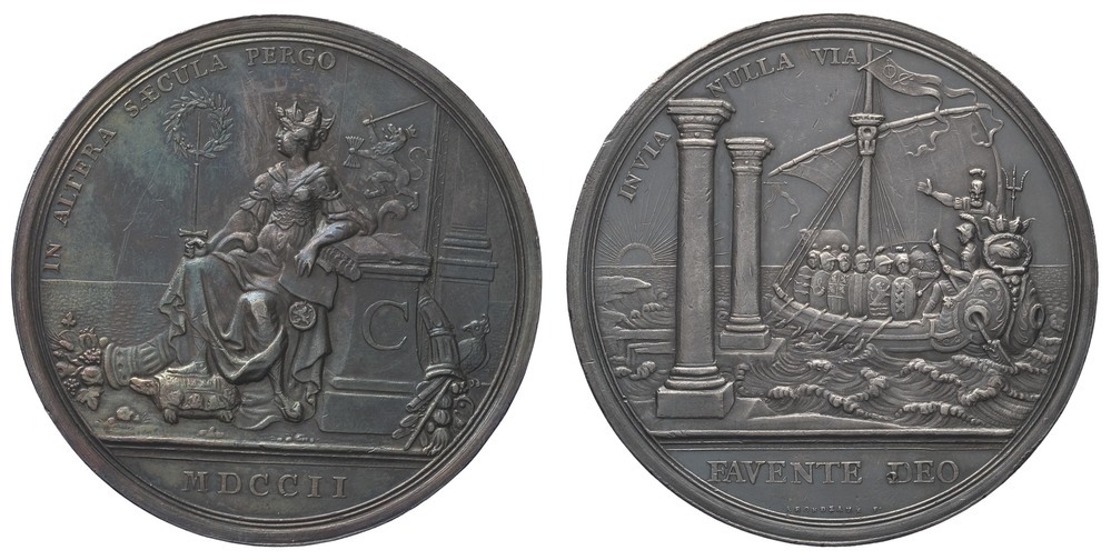 keerzijde: onder een omschrift een schip met soldaten met schilden en helmen dat door de zuilen van Hercules geroeid wordt. In de afsnede een opschrift en daaronder een signatuur.