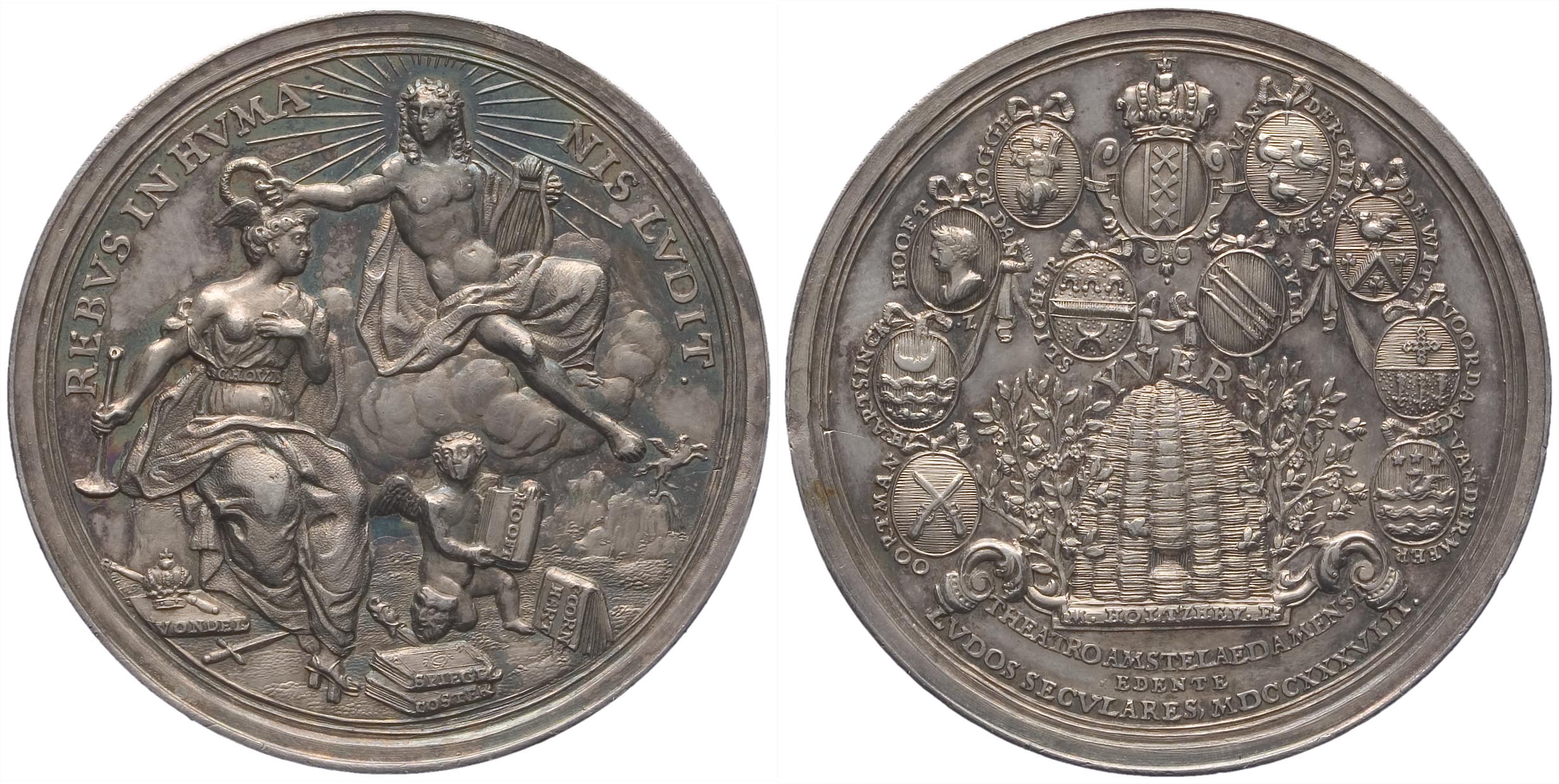 opschrift keerzijde: THEATRO AMSTELAEDAMENSI / EDENTE / LVDOS SECVLARES, MDCCXXXVIII.