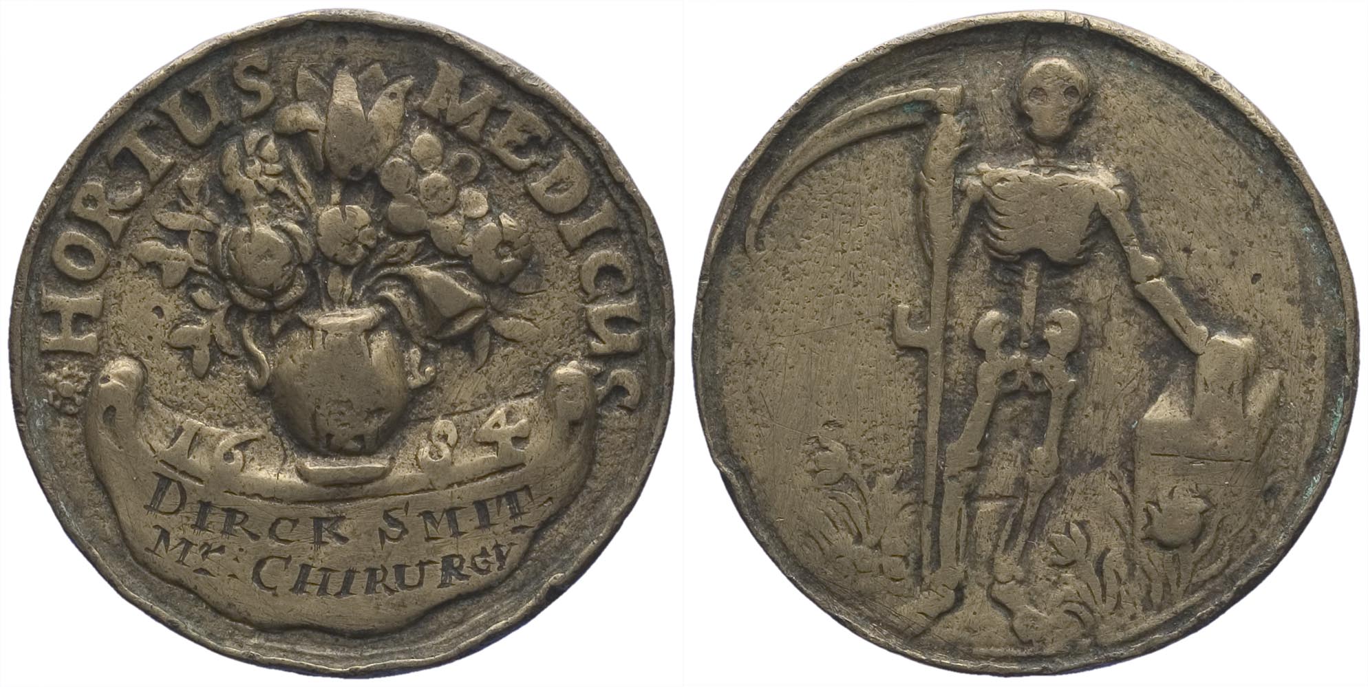 voorzijde: de dood als geraamte en face, in de rechterhand een zeis, de linkerhand rustend op een zandloper, geplaatst op een altaar.