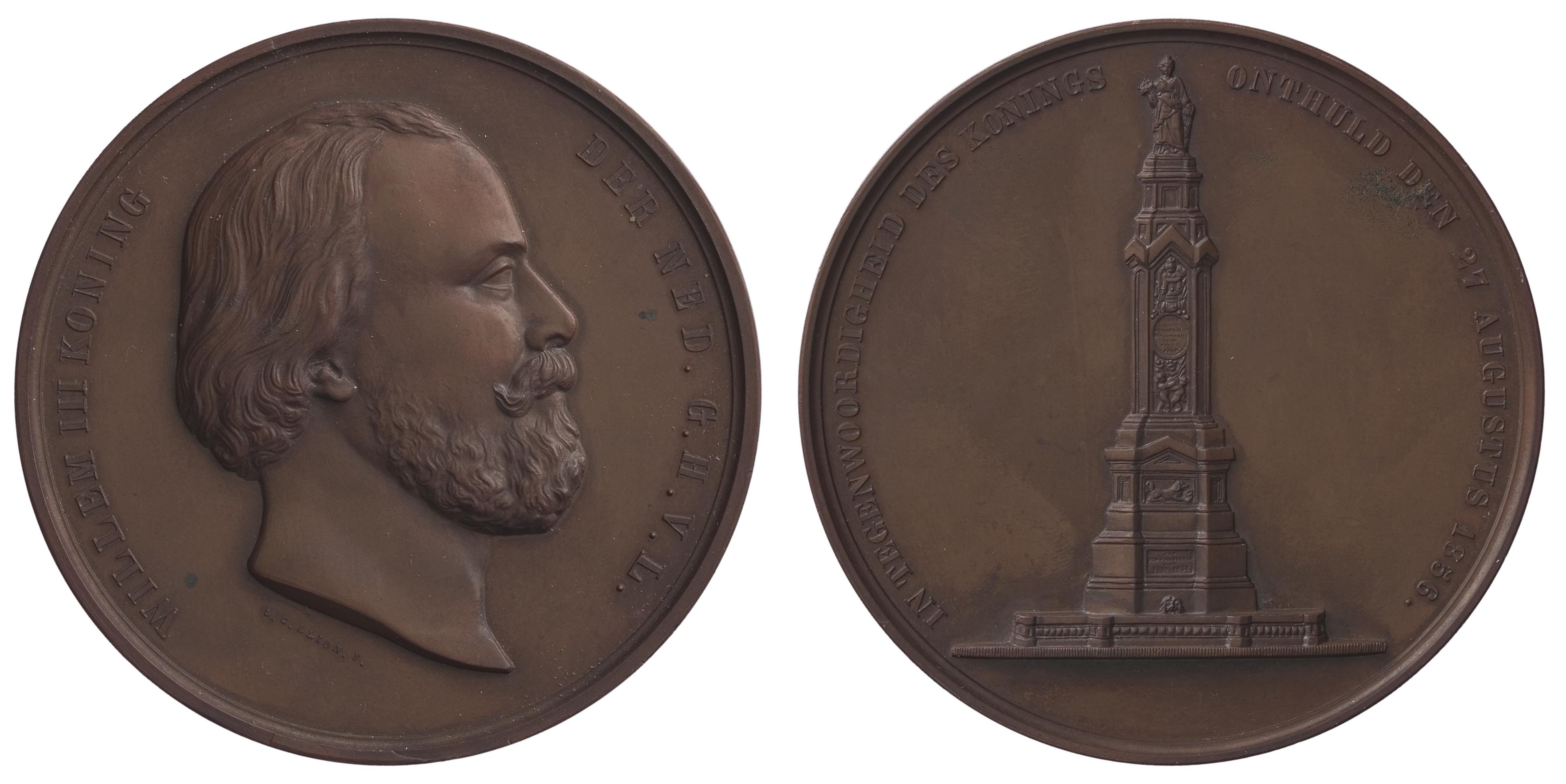voorzijde: rechtsgewend borstbeeld van Koning Willem III met omschrift. In de afsnede de ontwerpersnaam S.C. Elion.