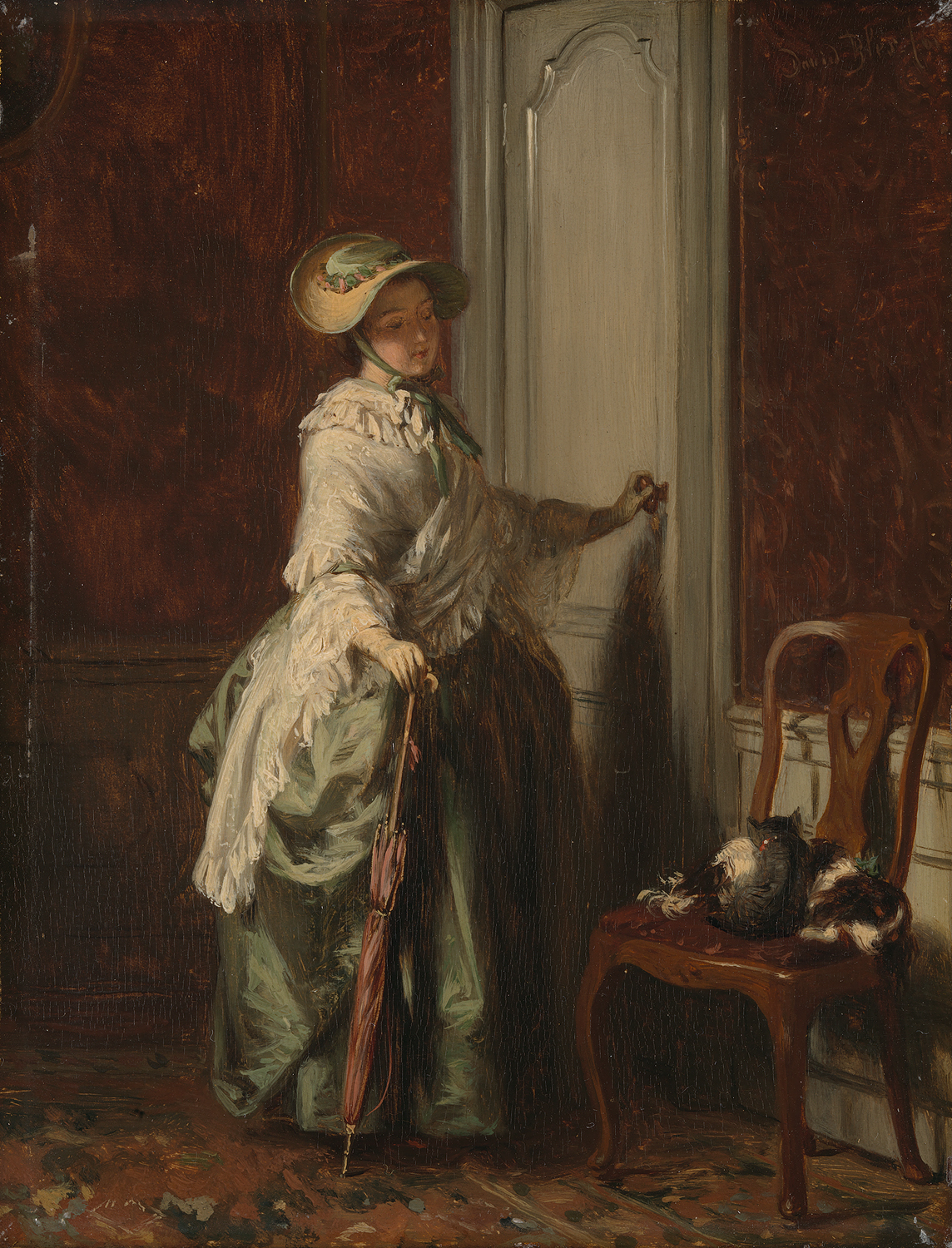 Een dame staat in uitgaanstoilet gereed een kamer te verlaten. Haar linkerhand rust op de knop van de deur. Zij werpt een blik naar een hond en een kat op een stoel.