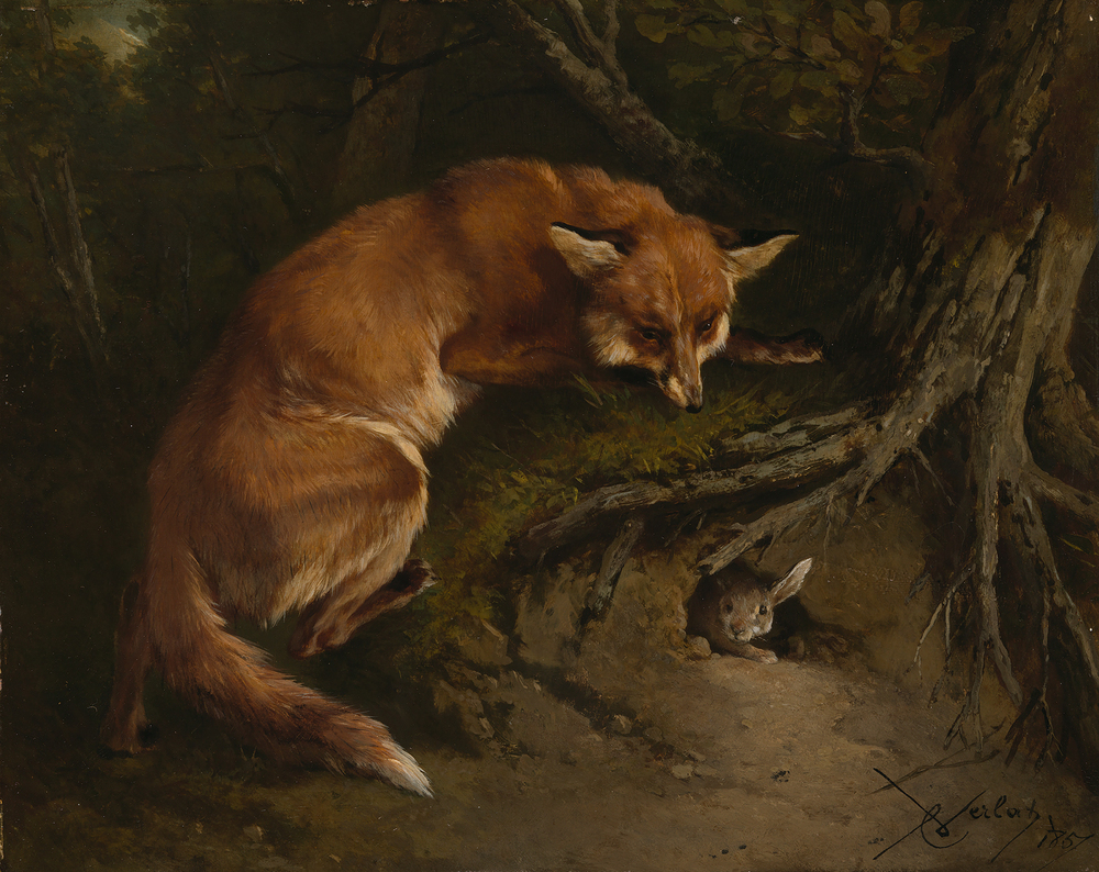 In een dicht beboste omgeving zit een vos aan de voet van een holle boom, op de loer bij een hol waaruit juist een konijn naar buiten komt.- Trefwoorden