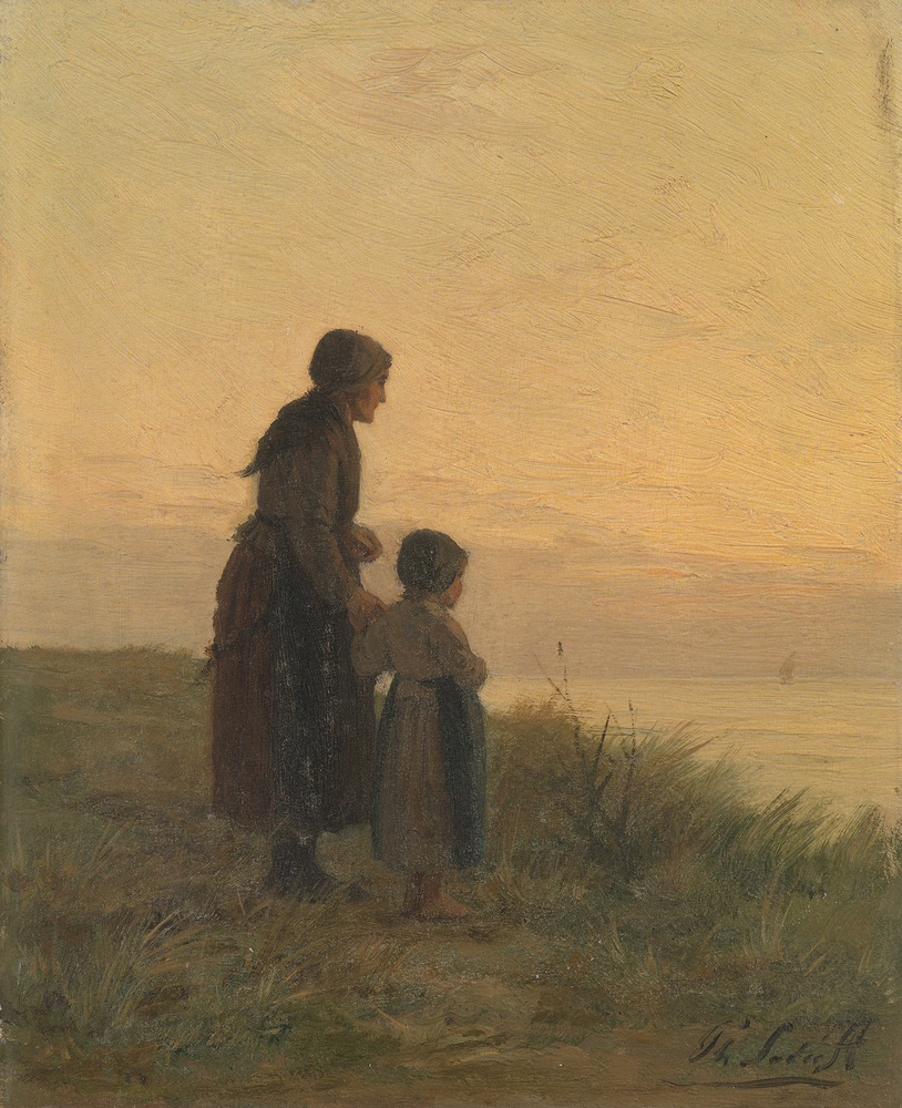 Philip Sadée was een schilder die tot de zogenoemde Haagse School behoorde, een groep negentiende-eeuwse schilders, die een realistischere weergave van het leven nastreefden dan hun Romantische voorgangers die de werkelijkheid idealiseerden. Op dit schilderij zien we een vrouw en een meisje op een duin naar zee kijken, ongetwijfeld in afwachting van de vissersboot van de vader van het gezin. In de verzameling van Van Eeghen zat nog een paneeltje van Sadée van nagenoeg dezelfde grootte, een strandgezicht waarop opnieuw een vrouw en een dochter te zien zijn pratend met een vissersvrouw. De sombere houding van de vrouw met dochter doet het ergste vermoeden. Wellicht kocht Van Eeghen de schilderijen gelijktijdig en waren ze bedoeld als pendanten. ( Sarah Remmerts de Vries)