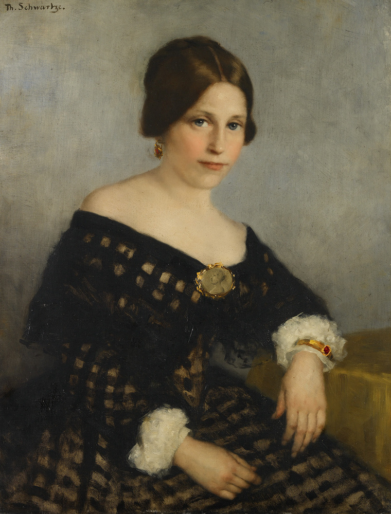 Dit is Sophia de Bruijn rond 1860. Schwartze baseerde zich op een foto uit die tijd. In 1860 trouwt De Bruijn met jonkheer Augustus Pieter Lopez Suasso. Het echtpaar blijft kinderloos en brengt een grote collectie kunst, mode en kunstnijverheid bij elkaar. Bij haar dood laat zij haar hele bezit na aan de stad Amsterdam. In de collectie van het Amsterdam Museum bevinden zich circa 5.000 objecten uit haar legaat. ( Tom van der Molen)
