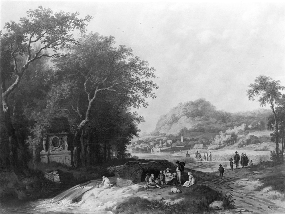 Op de voorgrond van een romantisch geschilderd landschap zitten bij een brokkelig stenen bruggetje enige rustende mensen. Links van hen een boompartij met gebeeldhouwd monument, waarvoor een kleine waterval zichtbaar is. Rechts op de achtergrond verheft zich tegen een lichtbewolkte lucht een begroeide berg, aan de voet waarvan een stadje is gelegen.