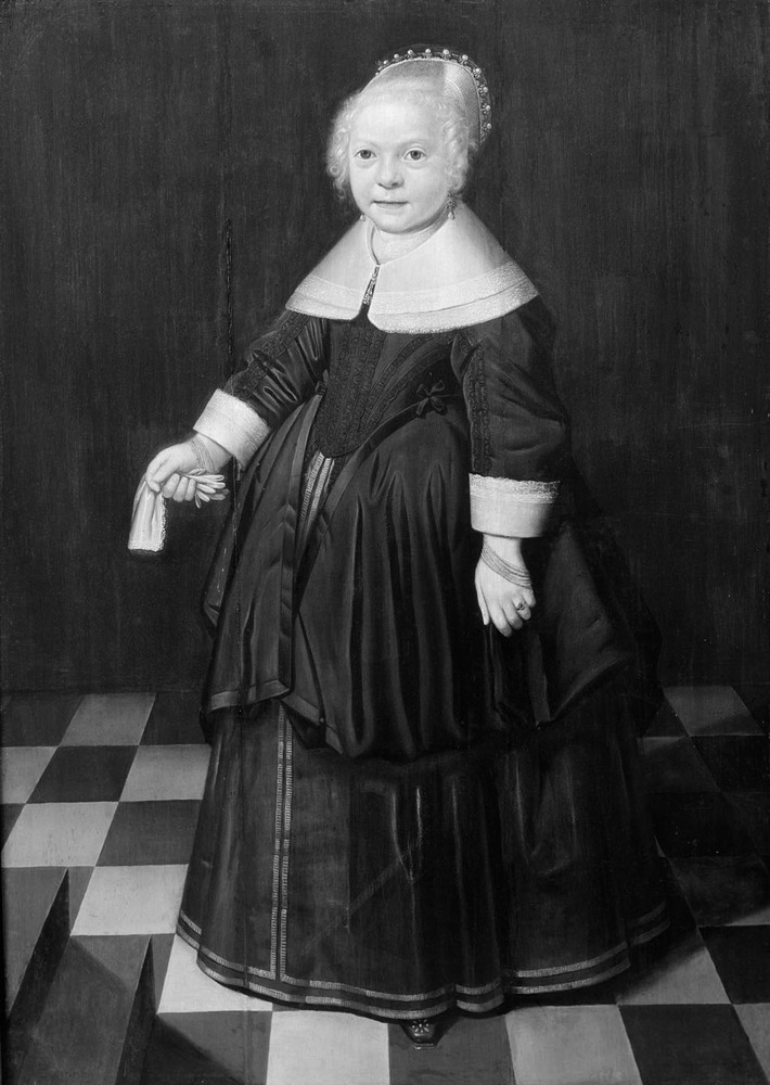 Klein meisje, met grote kanten kraag en manchetten, donker jakje en bruine rok tot op de grond, ten voeten uit; in haar rechterhand een witte handschoen. Links twee traptreden op zwart-wit geruite tegelvloer.