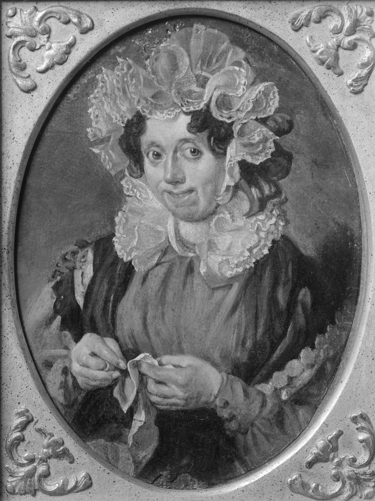 Portret van een dame, 1830 - 1900 karton, papier, olieverf hoogte: 19 cm; breedte: 14 cm; hoogte lijst: 28 cm; breedte lijst: 23 cm; dikte lijst: 4.3 cm; aankoop 1939-01-27 inv.nr. SA 602 in depot Portret van een dame tot buikhoogte; iets naar links gewend. Geplisseerde witte muts op het hoofd; naaldwerkje in de handen.