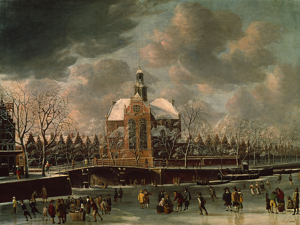 Op de voorgrond op de prinsengracht bij de brug over de anjeliersgracht ( nu Westerstraat) is de ijspret in volle gang. Op het ijs verkoopt een vrouw mosselen; rechts zijn een paar mannen aan het dobbelen. De noorderkerk is het eerste Amsterdamse kerkgebouw waarvan de architectuur volledig is afgestemd op de in de Protestantse dienst centraal staande preek. De kerk heeft de vorm van een kruis met vier gelijke armen. Misschien is Hendrick de Keyser de ontwerper. De in 1623 in gebruik genomen kerk is voltooid door de stadstimmerman Hendrick Jacobsz. Staets. De kerk is afgebeeld met het ommuurde kerkhof, dat nu is verdwenen.