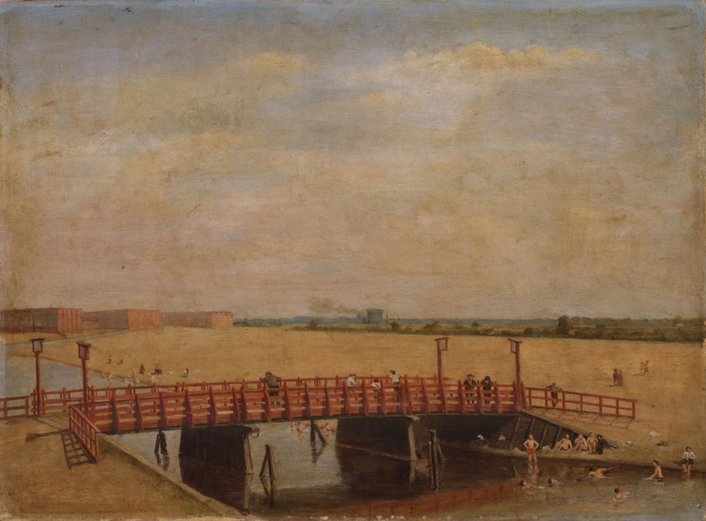 Jonkheer Barthold van Riemsdijk woonde aan de Pieter Lastmankade, die in de jaren 1920 de zuidelijke rand van de stadsbebouwing vormde. Later werd het oostelijke deel van de kade omgedoopt tot Jan van Goyenkade. Van Riemsdijk, die bouwkundig ingenieur was, schilderde de uitzichten waarschijnlijk vanuit zijn woning op nr. 2. Het bovenste schilderijtje toont de tijdelijke brug over het Noorder Amstelkanaal ter hoogte van de Emmastraat. Aan de voet van de brug maken badgasten dankbaar gebruik van het tijdelijke strand. Het onderste uitzicht toont het bouwrijp gemaakte land ten zuiden van het kanaal. De bomenrij markeert de loop van de Amstelveenseweg. Het oude stadion, op de plaats van het huidige Stadionplein, zou in 1929 worden afgebroken, één jaar na de Olympische Spelen van Amsterdam.