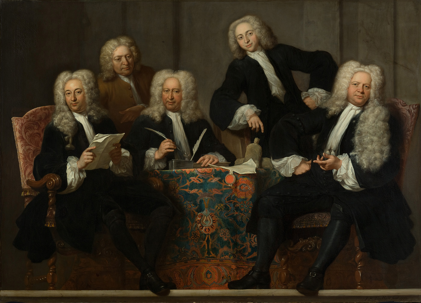 Een vijftal gepruikte heren, van wie drie aan tafel zittend en twee staande. Het gelaat naar de beschouwer gericht. De linker figuur heeft een gevouwen blad papier in de handen, de middelste hanteert een ganzenveer.