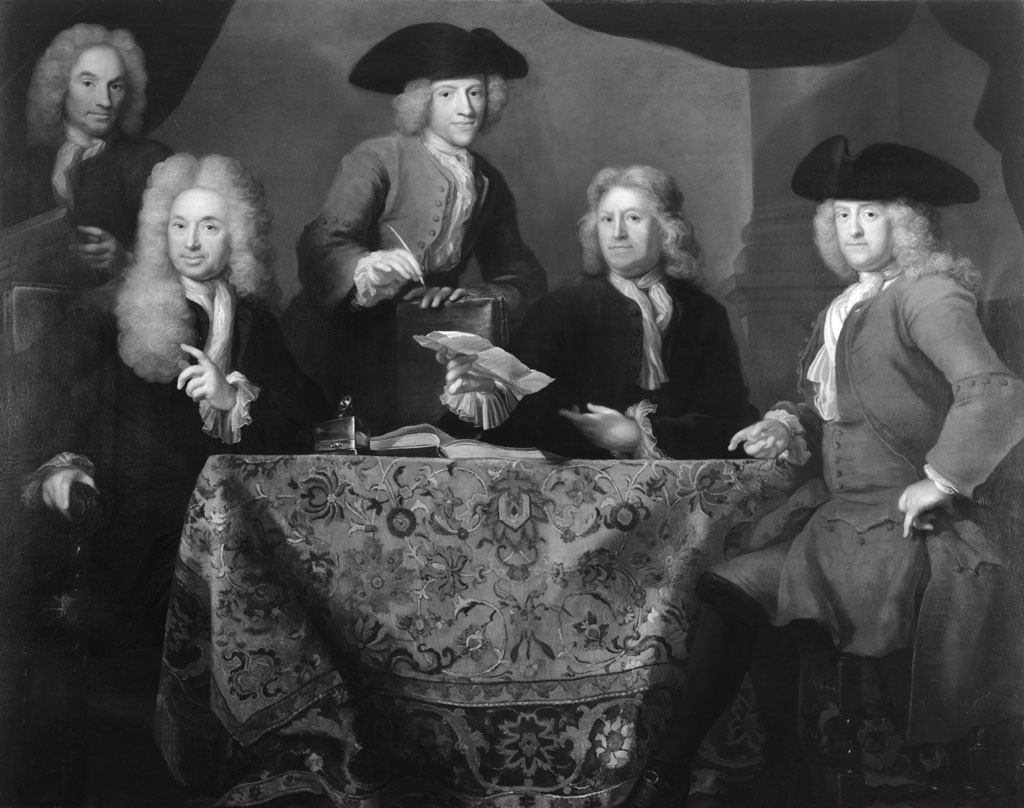Op de achterzijde een etiket: "no. 4: eene schilderij van Arnold Boonen (geboren te Dordrecht in 1669, overleden in 1729) van de jare 1725, met de portretten van vier regenten en eenen vader; tot dat tijdvak behoren:
