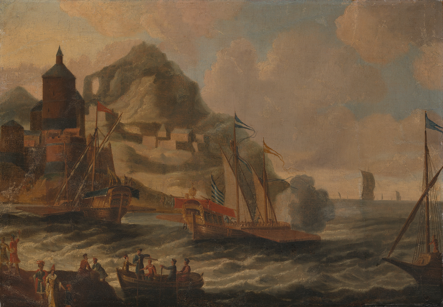 Haven waarin een tweetal galeien met uitgestoken riemen. Op de voorgrond een sloep met enige personen. Links een oude vesting gelegen tegen een hoge rots.