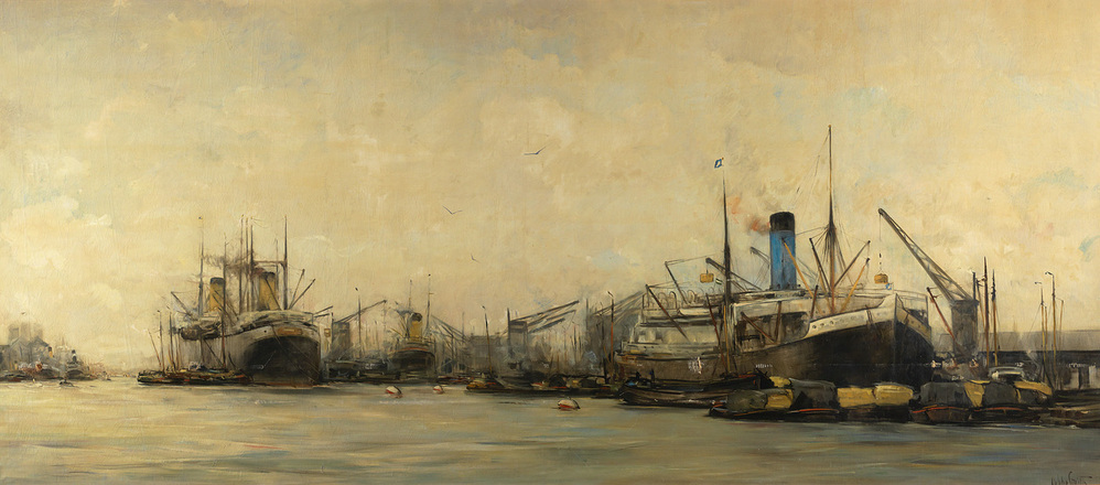 Tussen het IJ-eiland en de Oostelijke Handelskade was aan het begin van de twintigste eeuw een verbindingsdam aangelegd. Aan de oostelijke zijde van deze dam had men uitzicht op de Ertshaven en aan de westelijke zijde op de IJ-haven. Hobbe Smith koos ervoor om vanaf de verbindingsdam de IJ-haven in westelijke richting weer te geven, met zicht op de thuishaven van de Nederlandse Stoomvaart Maatschappij ‘Oceaan’ (NSMO). Hij schilderde een zogenaamde ‘blauwpijper’, afgemeerd aan de Javakade, en op de achtergrond ‘geelpijpers’uit de vloot van Stoomvaart Maatschappij Nederland.