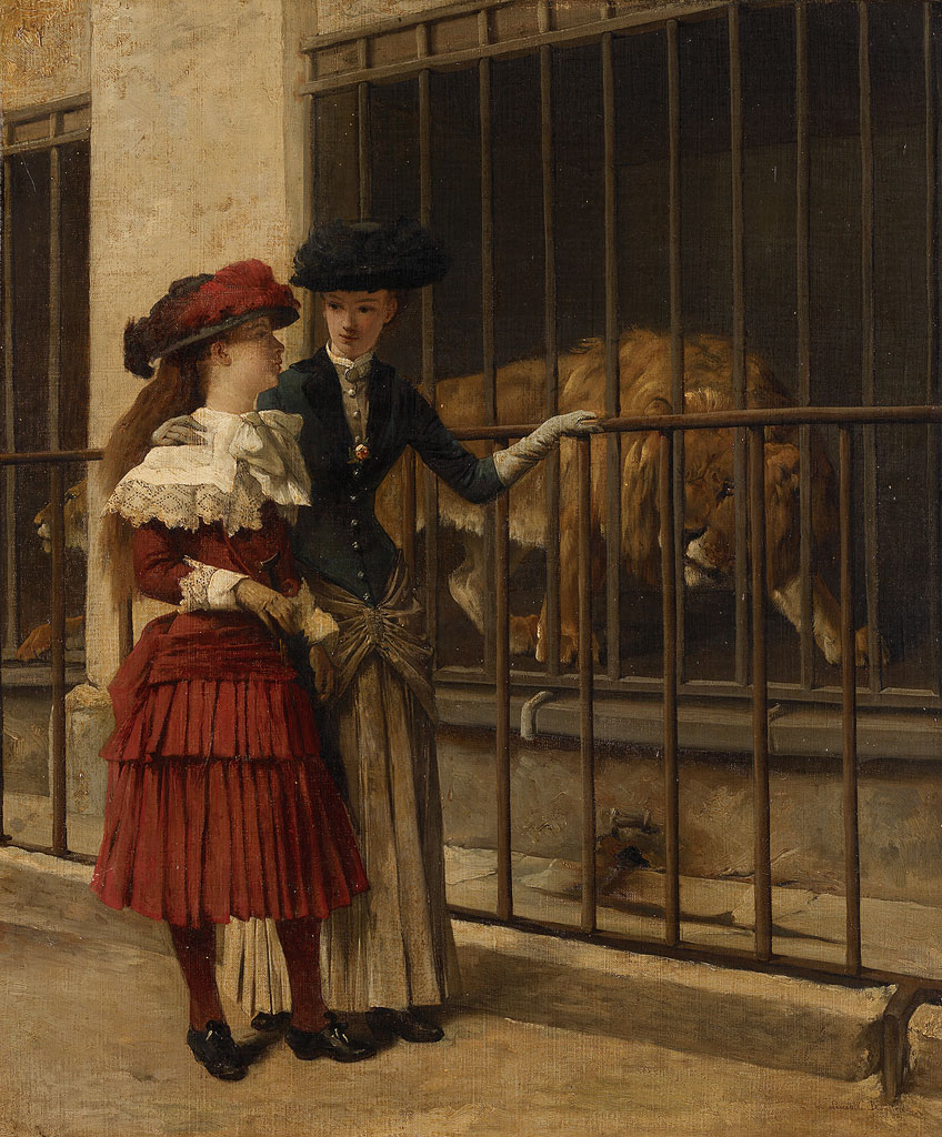 Lang werd verondersteld dat dit schilderij twee Amsterdamse vrouwen voorstelde tijdens een bezoek aan Artis. Het blijken echter twee Parisiennes te zijn, die de dierentuin in de Jardin des Plantes bezoeken. Oude foto's van de roofdierengalerij daar bevestigen dat. Louis-Charles Bombled was een schilder van Nederlandse komaf die in Parijs woonde en werkte. ( Tom van der Molen)