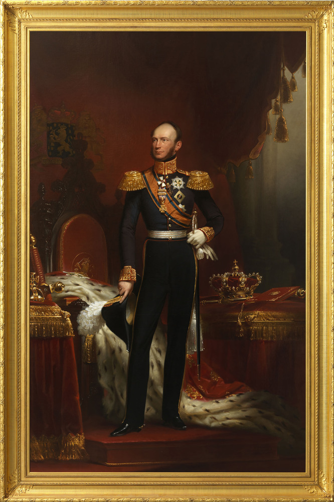 Koning Willem II ten voeten uit, de rechterhand aan de degen, in de linkerhand zijn steek. Rechts op een kussen de regalia. Links, nauwelijks zichtbaar, meerdere distinctieven. Op de zetel achter hem de hermelijnen mantel.