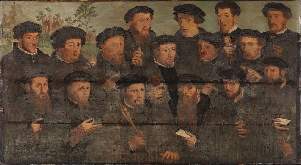 Zestien mannen met zwarte petten, het haar naar Bourgondische mode op oorhoogte recht afgeknipt. Zij zijn in rijen opgesteld, de voorsten tot het middel zichtbaar. De middelste man op de voorgrond heeft een pijl in de hand. Meer naar rechts een man, die een drinkglas vasthoudt. Links op de achtergrond een ruïne tussen geboomte.