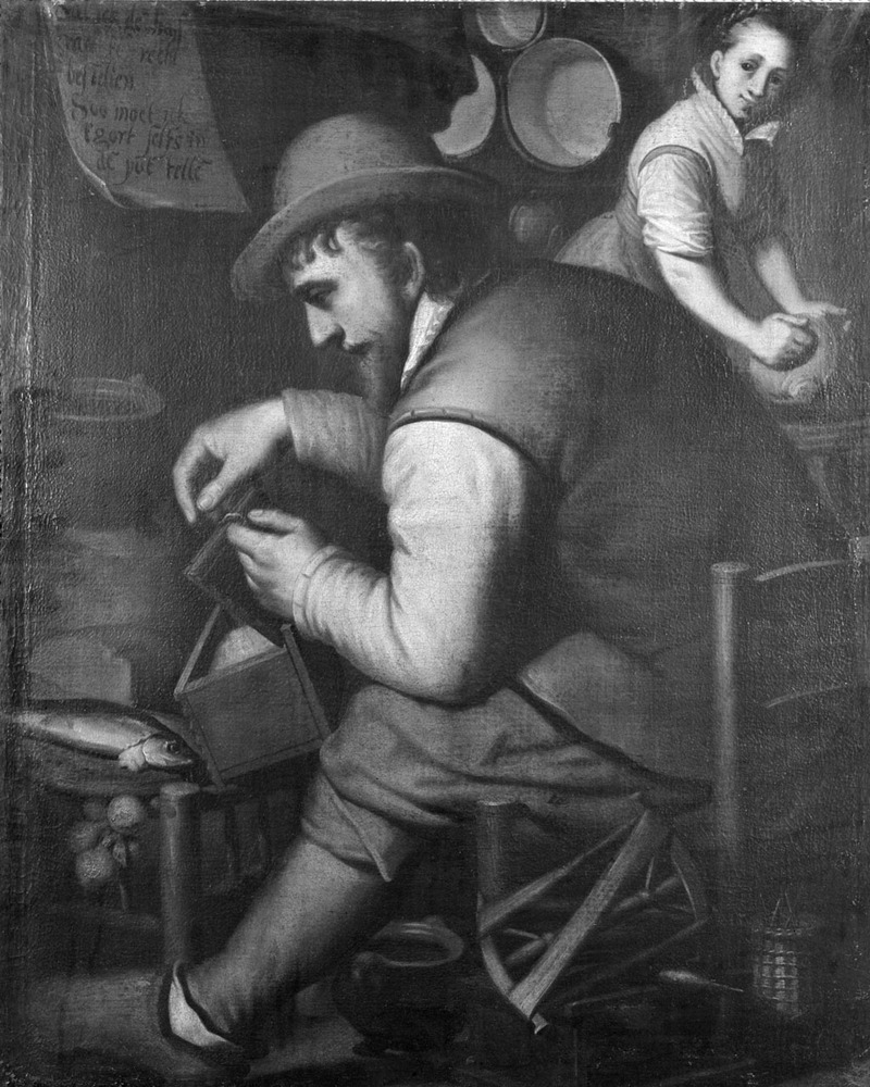 Aan de wand links boven een blad papier waarop de tekst: "Sal ick de huysraet te recht bestellen. Soo moet ick t'gort selfs in de pot tellen". Krielaart wijst er op dat het schilderij het 'zinnebeeldig schoorsteenstuk' kan zijn dat Wagenaar zag in de inschrijfkamer van het Nieuwe Zijds Huiszittenhuis, Door Scheltema gerangschikt onder de anoniemen. In de catalogi van het Rijksmuseum als kopie naar Pieter Aertsz. beschreven. De vrouw in de achtergrond is inderdaad onmiskenbaar Aertsz achtig, maar een andere compositie waarop één figuur (hier: de zittende man) vrijwel het hele beeldvlak in beslag neemt is mij van zijn hand niet bekend. De uitvoering der details is zeker te zwak voor Aertsen zelf. Wellicht werd het stuk ca. 1600 door een navolger vervaardigd.