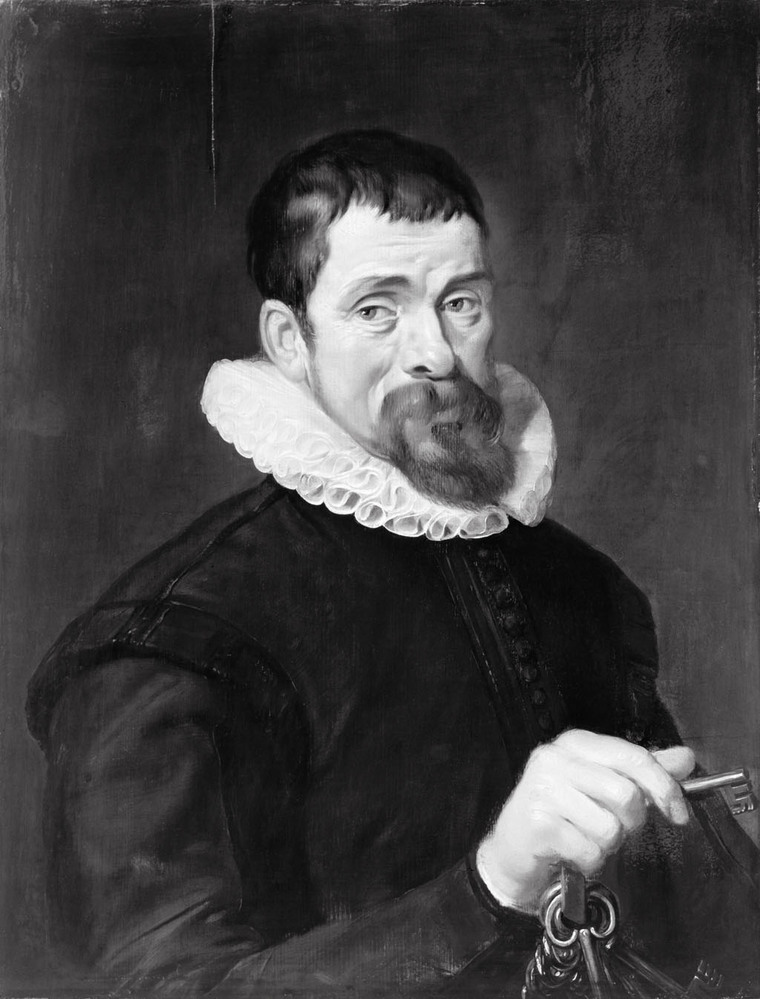 Mannenfiguur tot het middel; met puntbaardje, snor en geplisseerde kraag. Hij houdt een sleutelbos in zijn opgeheven rechterhand. Half naar rechts gewend, de blik schuin naar links.