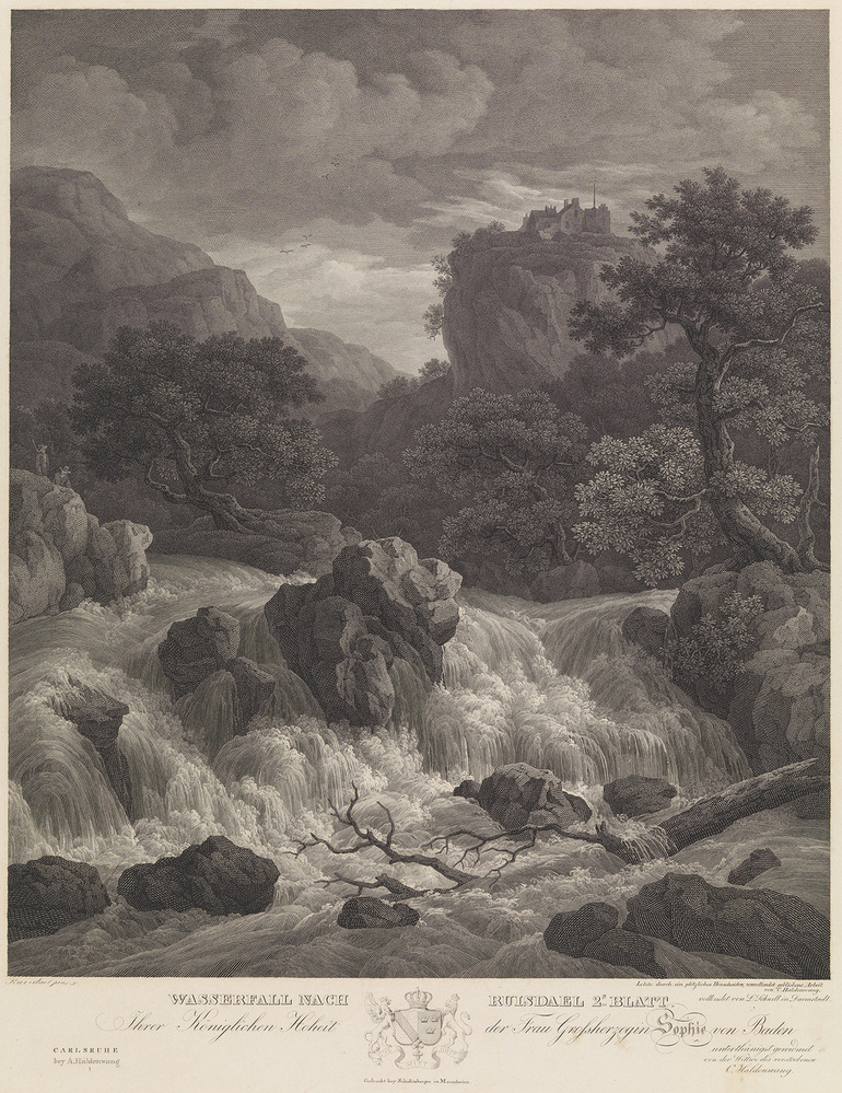 onderschrift midden onder in plaat: afbeelding familiewapen/WASSERFALL NACH RUISDAEL 2.s BLATT. Ihrer Königlichen Hoheit der Frau Grossherzogin Sophie von Baden.