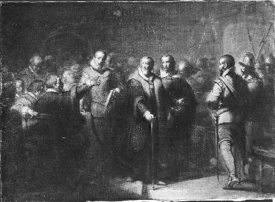 Kort na het afdanken der waardgelders werd Oldenbarnevelt [met zijn medestanders Hugo] de Groot, Hogerbeets en Ledenberg op bevel der Staten-Generaal, gevangen genomen. Pas in het jaar daarna stelde men vijfentwintig rechters over hen aan, van wie twaalf uit Holland en twee uit elk der andere provincies afkomstig waren. (...)