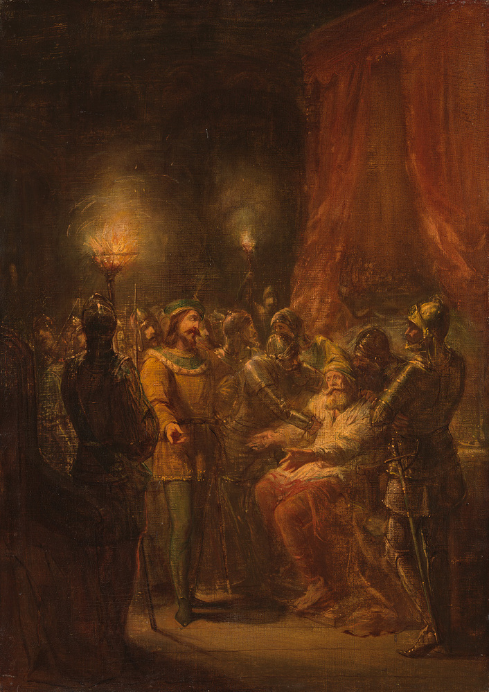 [Hertog Arnoud van Gelre en diens zoon Adolf hadden zich na een ernstige vete verzoend. Adolf verbrak op verraderlijke wijze de overeenkomst. Toen hij] zich omstreeks kersttijd naar zijn vader op het kasteel te Grave begeven had, liet hij deze door een bende huurlingen in de nacht van 10 januari 1465 van het bed lichten en over het ijs - dat op zijn verzoek, onder voorwendsel van ijsvermaak, niet was opengehakt - naar het slot van Buren vervoeren. Daar dwong Adolf zijn grijze vader hem de regering af te staan. ( Dedalo G. Carasso)