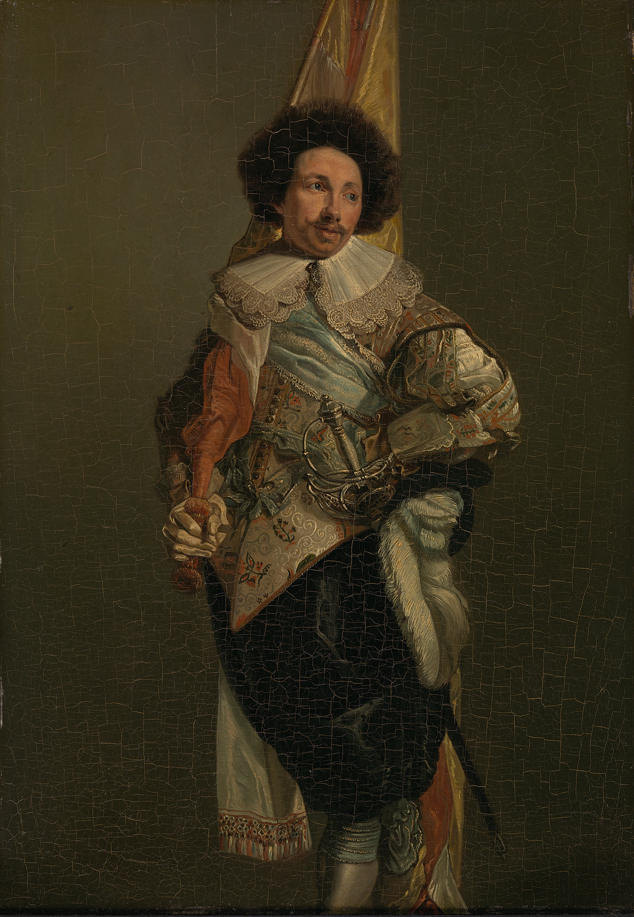 Vaandrig in 17e eeuwse kledij met kanten kraag; tot even onder de knie, het vaandel over de linkschouder. Het lichaam driekwart naar links, het hoofd met weelderige donkere haardos, iets naar rechts. Hij heeft de rechterhand in de zijde en houdt daarmee tevens een bepluimde hoed vast. Grijsgroen fond.