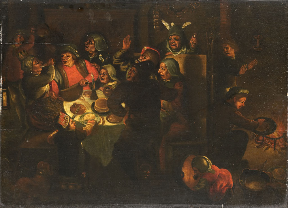 In een boereninterieur wordt het Driekoningenfeest met een feestmaal gevierd. Een familie met kinderen zit rond een tafel, sommigen dragen rare hoedjes op het hoofd. Terwijl een vrouw links aan tafel een glas leegdrinkt zingen de anderen een lied. Rechts worden bij de haard pannenkoeken gebakken. Links bij de deur een man met een kruik en een lantaarn