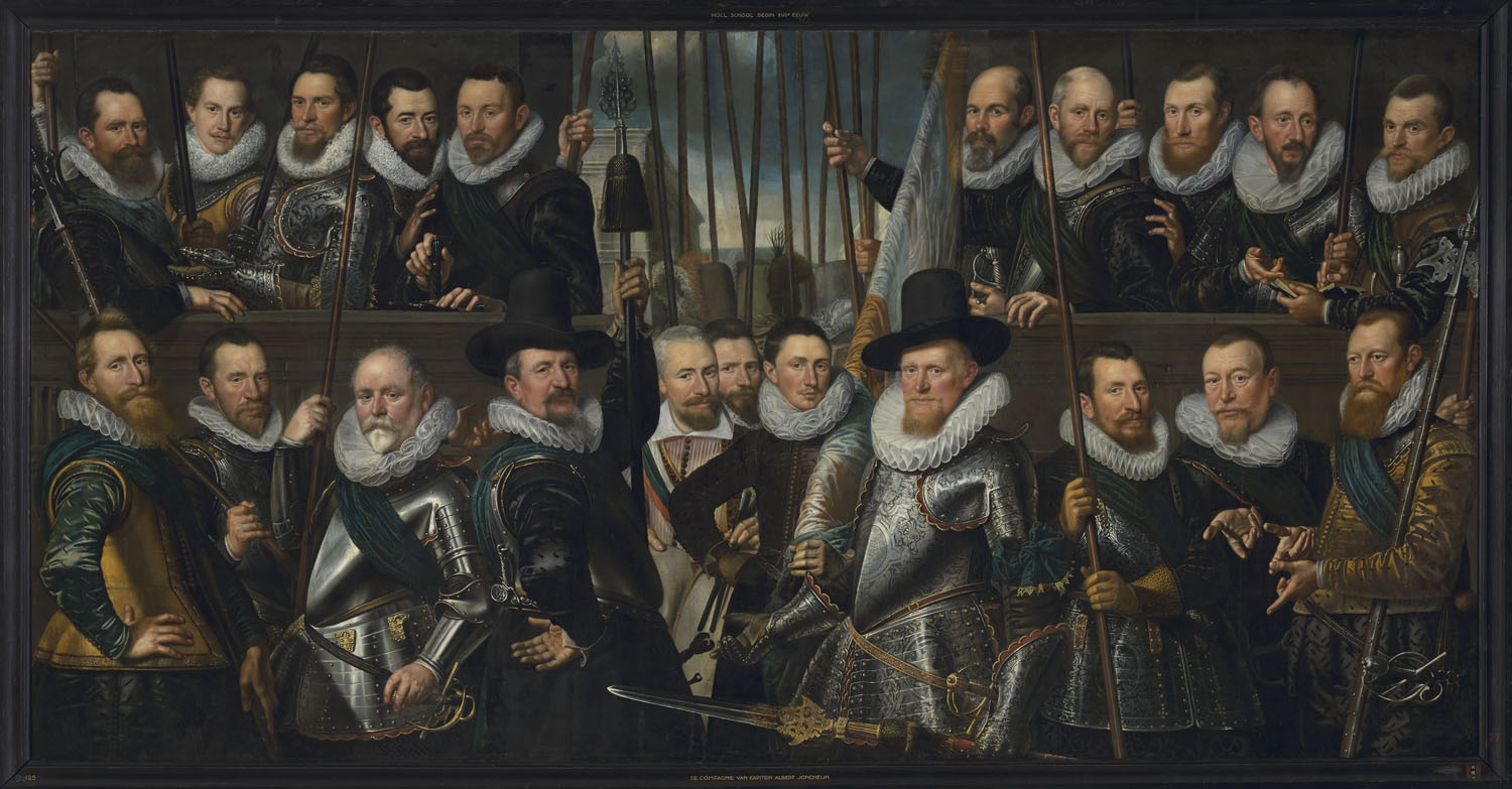 De traditionele wijze om schutters uit te beelden, in twee rijen boven elkaar, is hier op originele wijze doorbroken: de 21 schutters zijn gescheiden door een doorkijk met een zicht naar buiten. De vele lansen en hoeden suggereren dat ook de rest van de compagnie is afgebeeld. De kapitein, in het zwart gekleed en van een korte piek voorzien, bevindt zich links van de doorkijk; tegenover hem, aan de andere kant van de vaandrig, staat de luitenant in een rijkversierd kuras. Prominent naast de vaandrig is de trommelaar afgebeeld, die waarschijnlijk vanwege zijn lage rang niet in staat was zelf voor zijn portret te betalen.