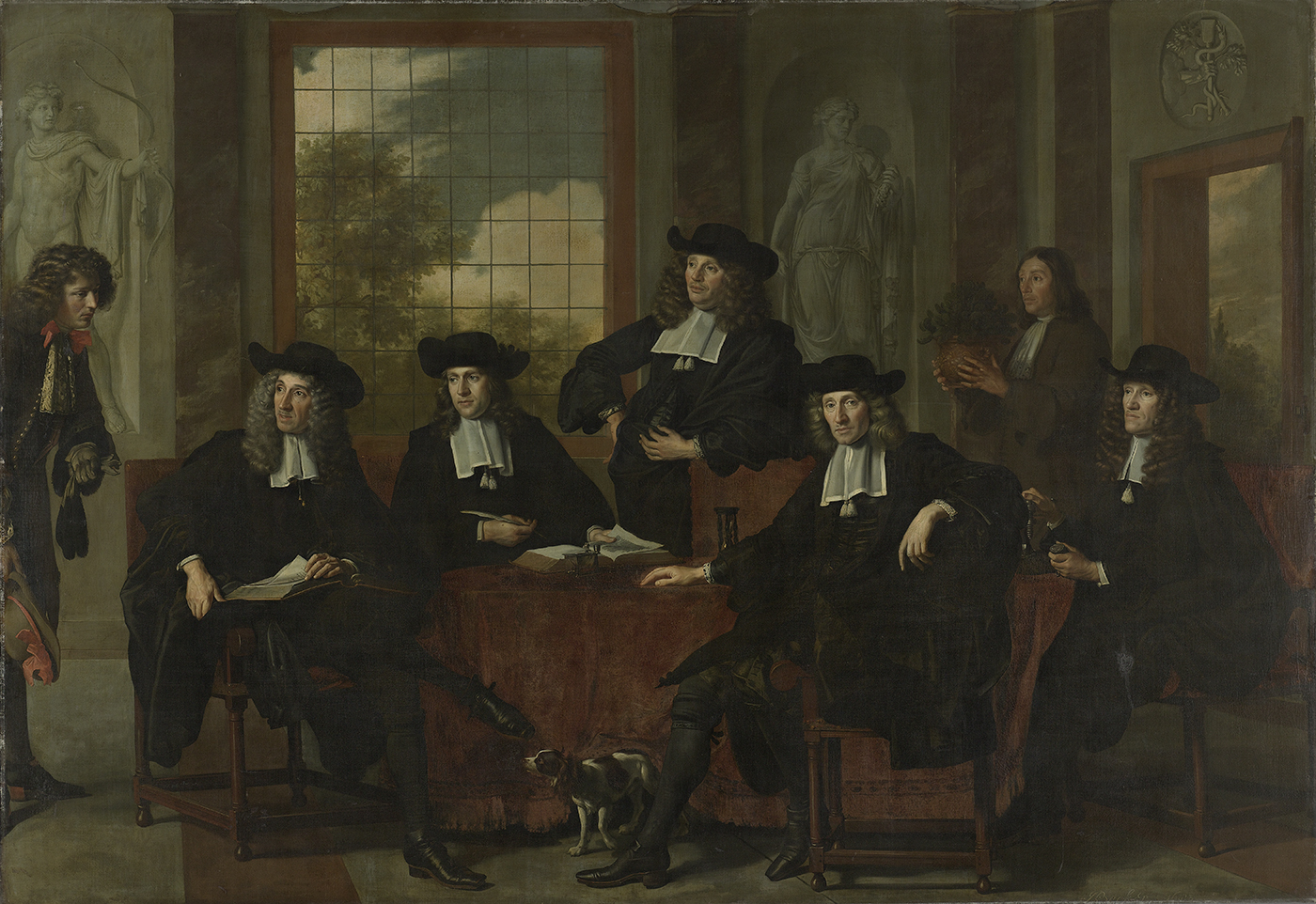 Het gezelschap, verenigd aan een tafel, ontvangt bericht van de gildeknecht Sieuwert van Duynen (links). De beelden zijn ten voeten uit. Op de muur voorstellingen van Apollo en een godin.