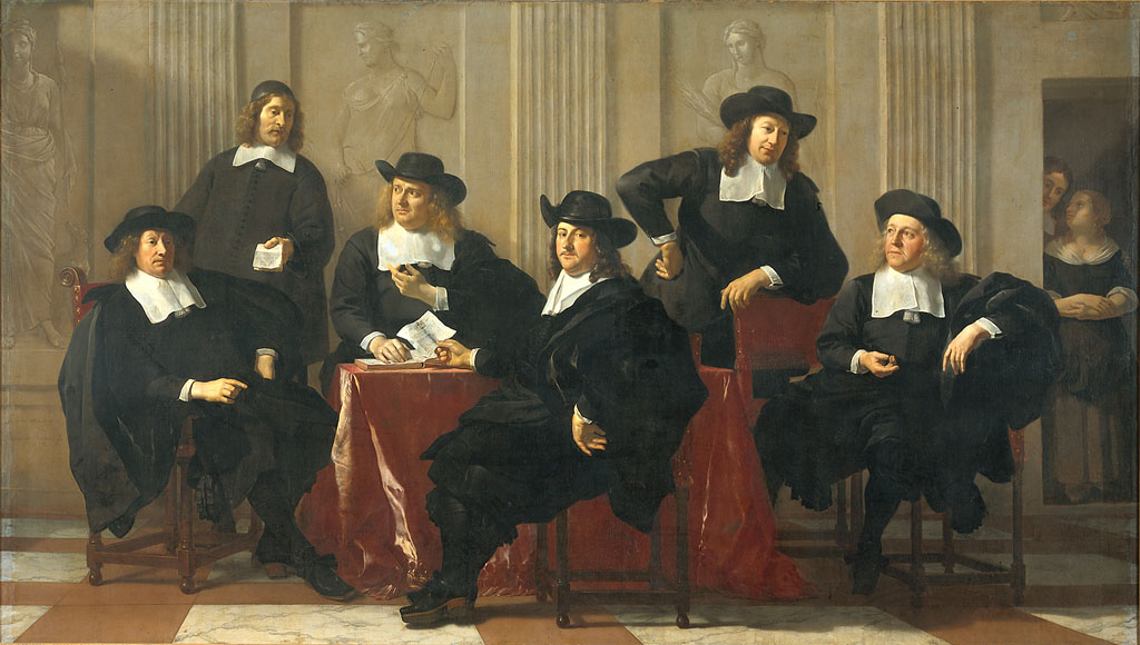 Groepsportret van de regenten van het Spinhuis en Nieuwe Werkhuis te Amsterdam, 1669. Zittend en staand rond een tafel voor een wand met allegorische vrouwenfiguren in reliëf. Voorgesteld zijn Michiel Tielensz, Joris Croock, Hendrik Becker, Joannes Commelin, Willem Muilman de Jonge en een bediende