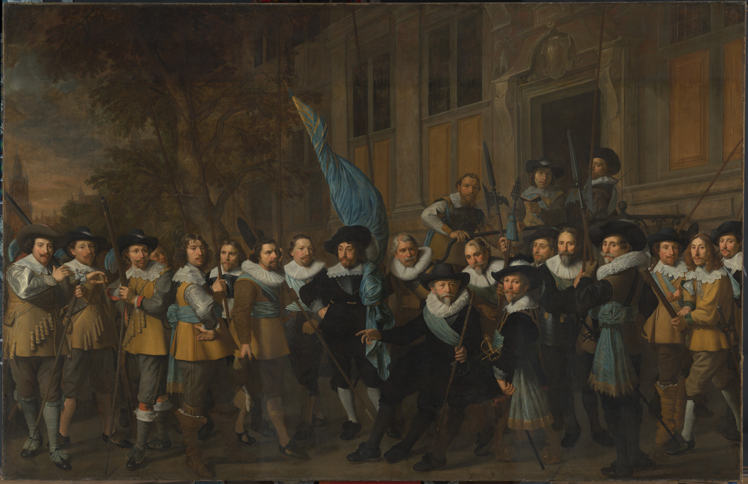 In 1631 is de nieuwe grote zaal van de Kloveniersdoelen klaar. Voor de hoge wanden worden maar liefst zeven groepsportretten besteld. Dit schilderij komt direct naast de Nachtwacht te hangen. Anders dan Rembrandt zet de maker, Nicolaes Pickenoy, alle mannen er goed zichtbaar op. Het zijn immers zijn opdrachtgevers: per persoon hebben ze zo’n 60 gulden betaald.