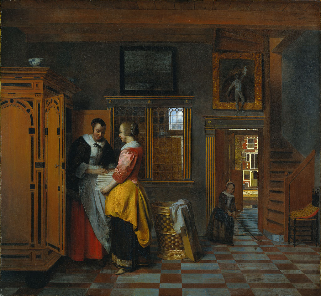 Binnenhuis met twee vrouwen, een moeder en dochter, die gevouwen linnengoed opbergen in een linnenkast. Naast de jonge vrouw, rechts, staat een rieten wasmand en een houten blad. Bij de deur van de kamer speelt een meisje met kolfstok en bal. Rechts staat een stoel bij de trap naar boven, achter het meisje een doorkijk door het huis naar de gracht buiten. Boven de deur staat een beeldje voor een schilderij