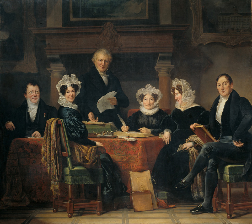 Groepsportret van de regenten en regentessen van het leprozenhuis van Amsterdam 1834-35. Zittend rond een tafel: Ludovicus Hamerster Ameshoff, Jan van der Meer de Wijs, Michiel Abraham van Peene Pietersz, Jacoba Wilhelmina de Meyn, née van der Meulen, Sara Maria Joanna van der Poorten van Vollenhoven, née Berg en Catharina Elisabeth van Vloten, née Bagman. Op tafel liggen boeken en papieren en een inktstel, tegen een tafelpoot meer boeken geleund. Op de achterwand een schilderij van het Stadhuis op de Dam