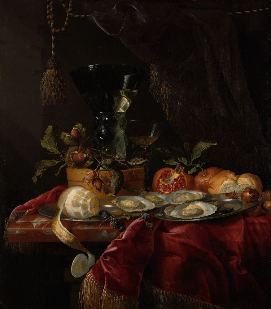 Op een marmeren plaat, gedeeltelijk bedekt met een rood kleed, twee tinnen borden, met oesters, een half geschilde citroen en bramen, daarachter nog meer vruchten en een half gevulde roemer, rechts een met koord opgenomen paars fluwelen gordijn.