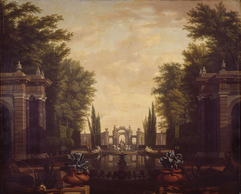 Mevrouw Bienfait toonde aan dat zulke "zuidelijke en theatraal aandoende" parken ook in het echt in Nederland werden aangelegd. Een dergelijke ronde vijver met gelijksoortige bouwsels op eendere wijze eromheen gegroepeerd bestond b.v., zo blijkt uit afbeeldingen, op het landgoed Zijdebalen in Utrecht (Bienfait, blz. 223, afb. 294). Staring opperde dat ons stuk een ontwerp voor zo'n tuin zou kunnen zijn: "Slechts de cypressen doen ons on Hollands aan". Martin had geen waardering voor De Moucherons kunst en beeldde ons stuk af ter illustratie. ( Albert Blankert)